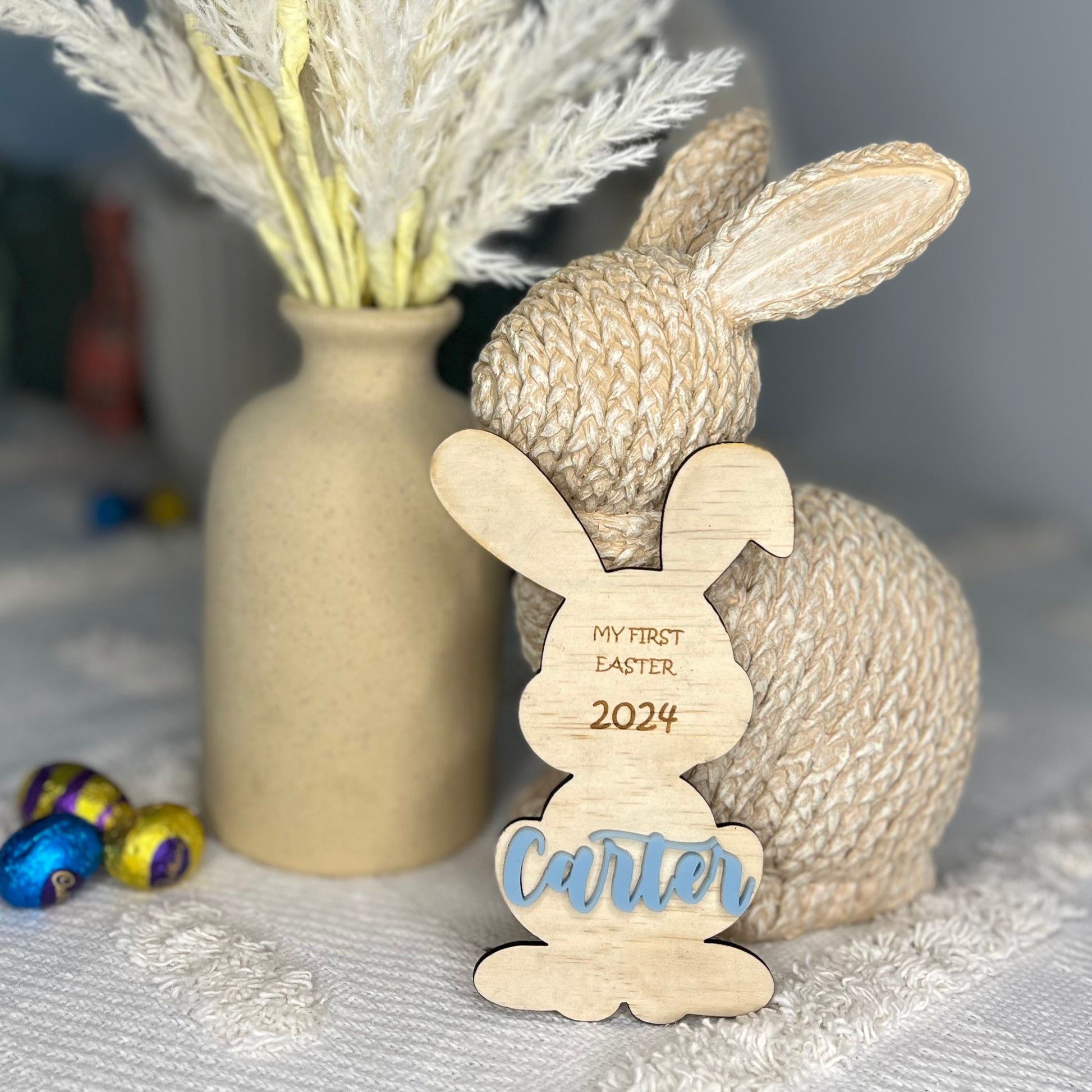 Celebrate your little one's first Easter with our charming Bunny-Shaped "My First Easter" Tag! Crafted with care from high-quality 3mm plywood and adorned with an acrylic name, this delightful piece adds a touch of personalised flair to your Easter festivities.